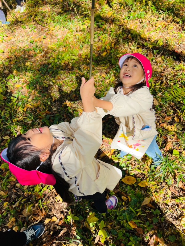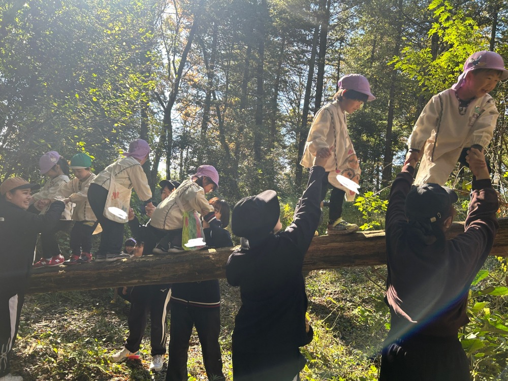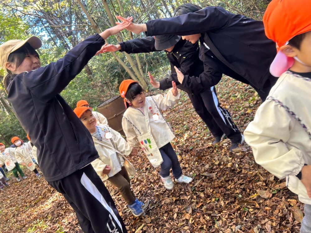 共和大学の『こどもの森教室』に行きました。大学の職員の方や学生さんと共に、森の中を散策して、木の実やきのこ、落ち葉などの秋の自然に触れ「きのみみつけた!」「フワフワのきのこだ!」などと、普段触れることのできない自然物に興味津々の子どもたち。また、学生さんが、手を取りながら優しく言葉をかけてくれて、学生さんと思いを共有できたことにとても嬉しそうな姿が見られました。秋の自然や学生さんとの出会いの中で、充実した時間となりました。