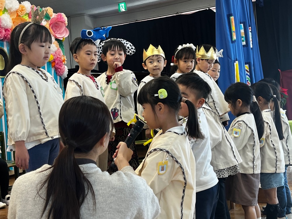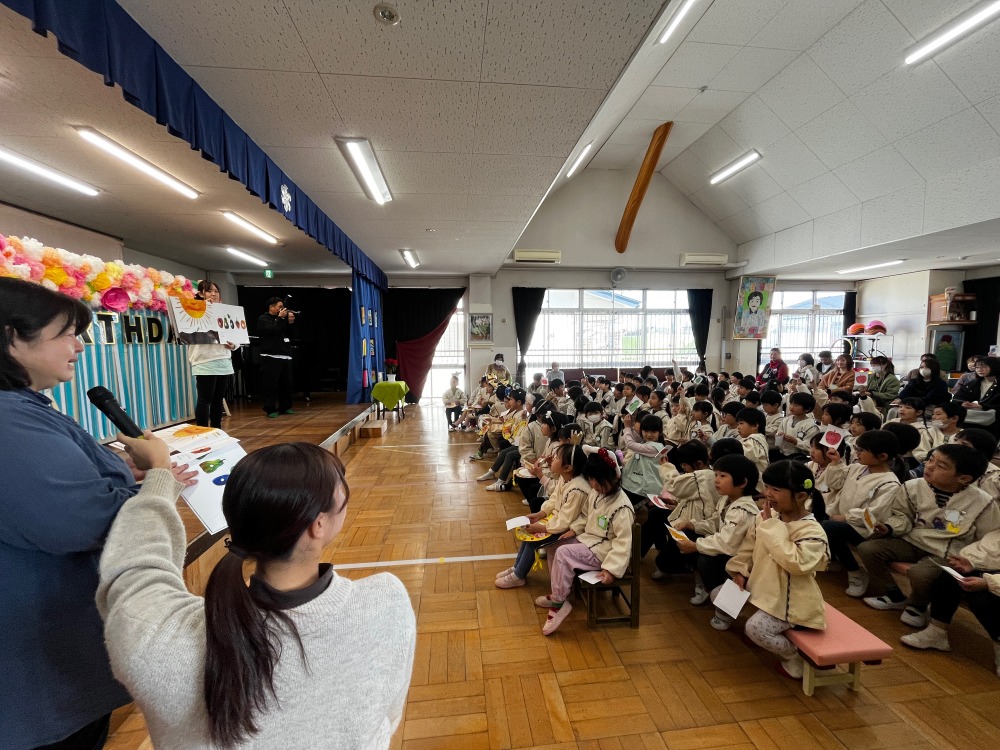 誕生会を楽しみにしていた子どもたち。『やきいもグーチーパー』や『きのこ』の歌を元気いっぱい歌う様子がありました。お誕生日カードのプレゼントでは「Thank you.」と嬉しそうな表情でもらい、誕生日のお友だち同士で見せ合っていました。保育者からの出し物のプレゼントで『はらぺこあおむし』の大型絵本を見ると、お話をよく聞いて、出てきた食べ物のカードを挙げ、楽しく参加しました。