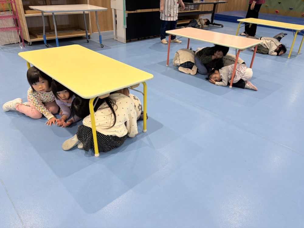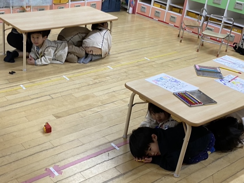 延長保育時間中に地震が発生する想定で避難訓練を行いました。日中の避難訓練とは異なる状況でしたが、子どもたちは話をよく聞き、落ち着いてテーブルの下に潜る等、身の安全を守る行動をとっていました。