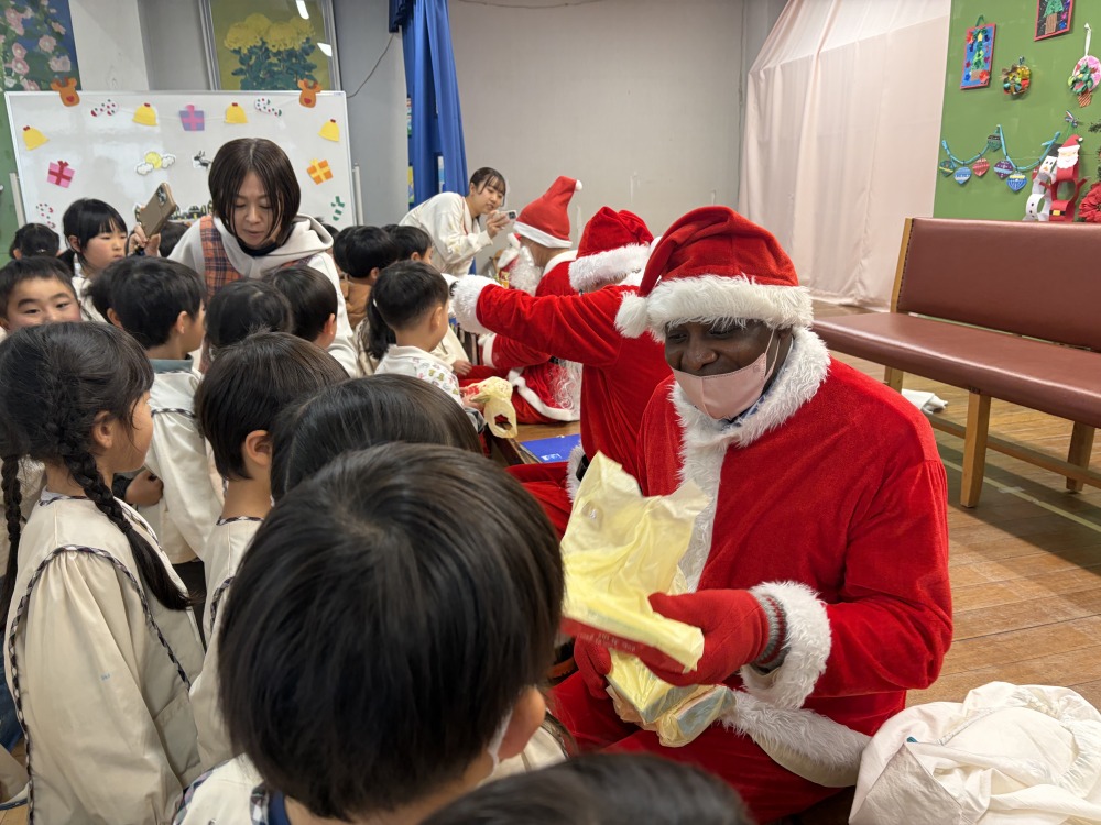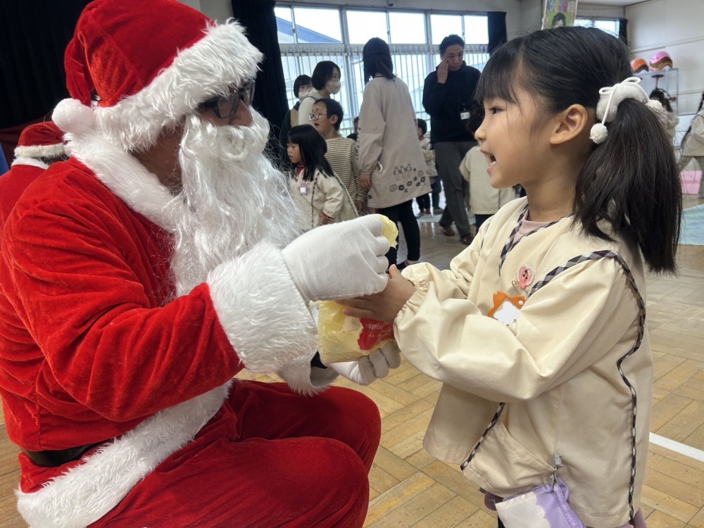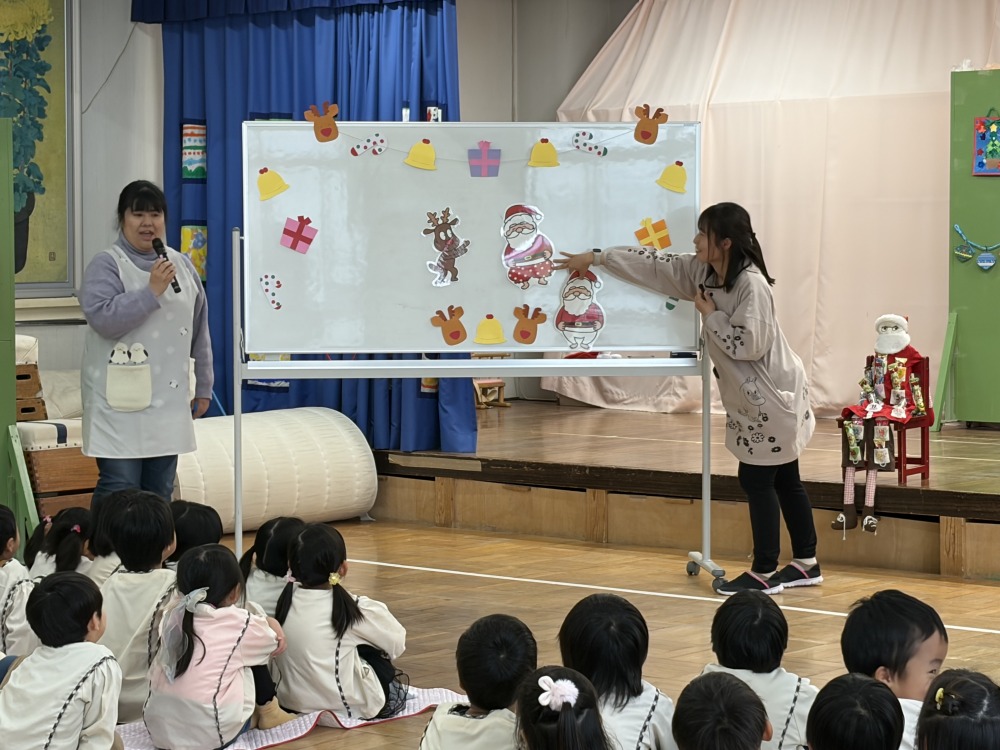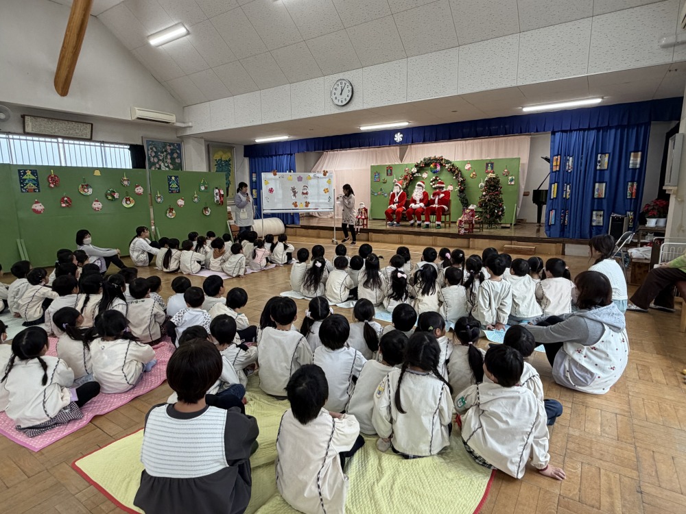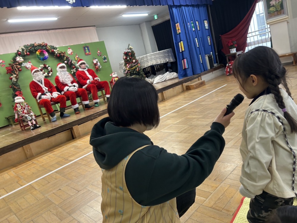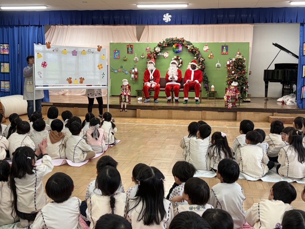 年少組、年中組、年長組は各学年ごとホールでクリスマス会を行いました。「あわてんぼうのサンタクロース」の歌を歌ったり、先生たちの「いそいでサンタさんをきがえさせよう。」のパネルシアターを見ました。舞台の緞帳を開けると3人のサンタさんが居ました。子どもたちはサンタさんにインタビューをしたり、プレゼントをもらったり、写真を撮ったり楽しい時間を過ごしました。