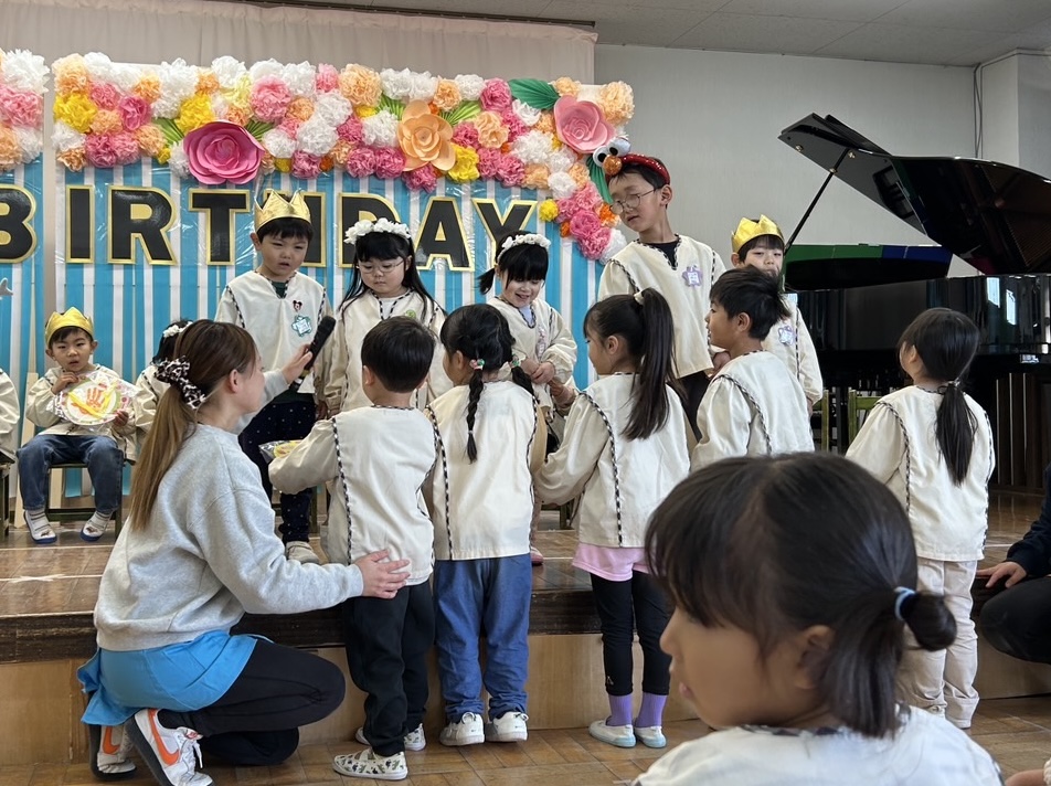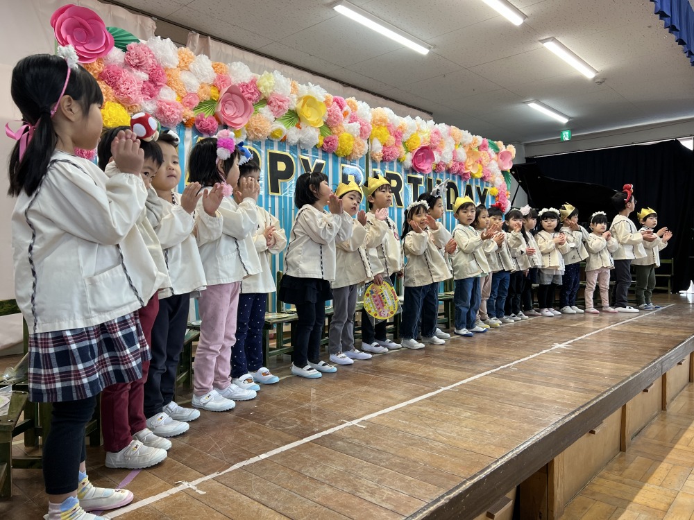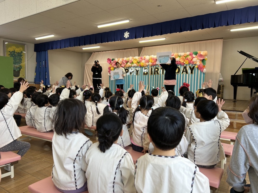 みんなでお誕生日の歌や英語の歌を元気いっぱいに歌い、先生からの「きんぎょがにげた」の絵本の出し物では、最後のクイズも大盛り上がりでした。