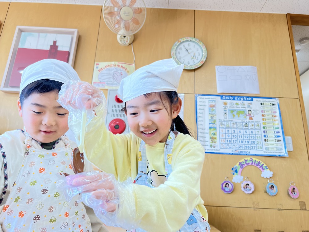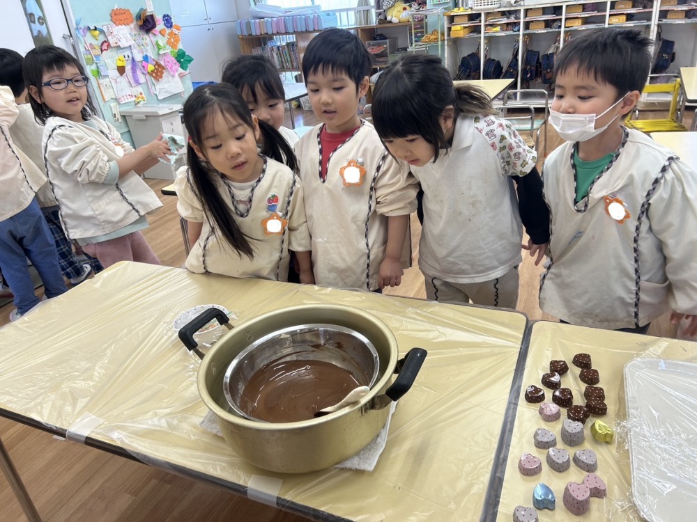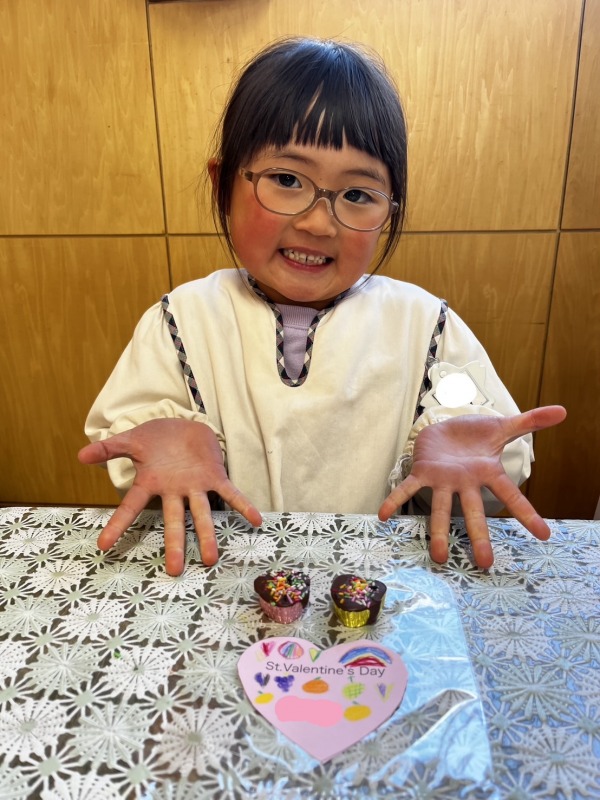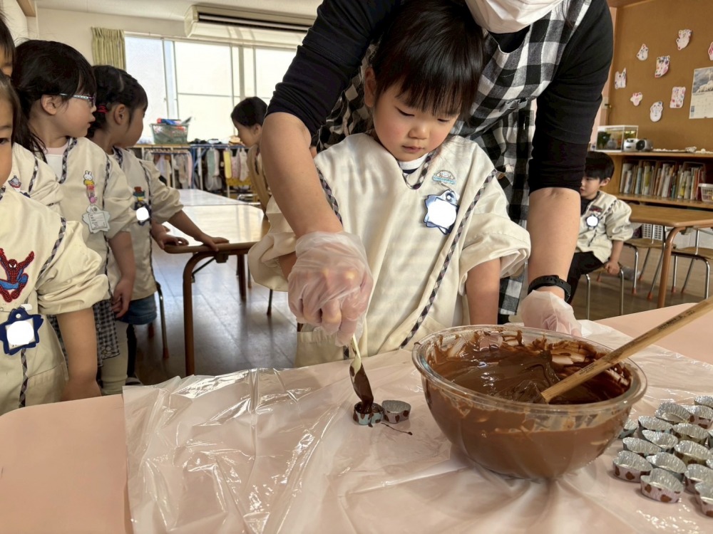 溶かしたチョコレートをハート型のカップにそっと入れ、上からカラースプレーをふりかけると、色とりどりの可愛らしいチョコレートが完成しました。チョコレート作りをする中で、「チョコの甘い匂いがする!」「早く食べたいな。」などと目を輝かせながら楽しそうに会話する子どもたちの姿が見られました。チョコレートを固めている間も、「まだかな?」「できたかな?」と完成を楽しみに待つ様子が、とても微笑ましかったです。