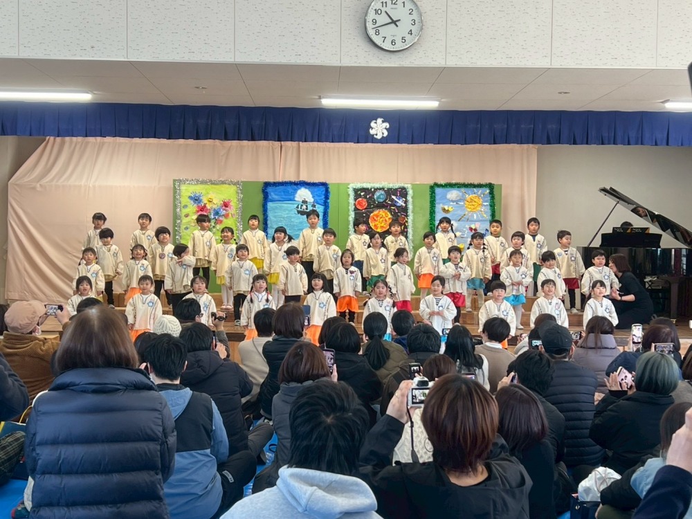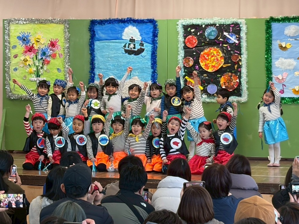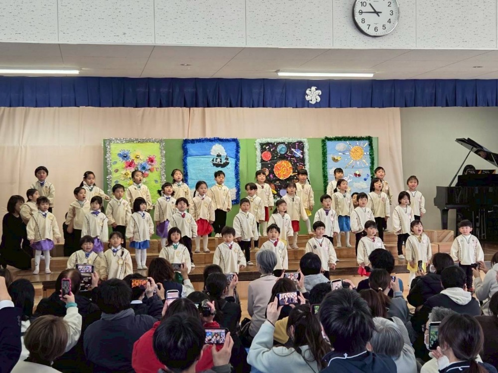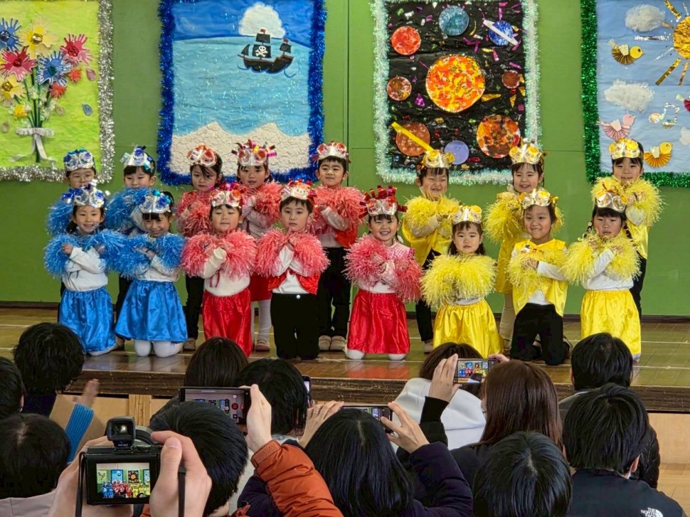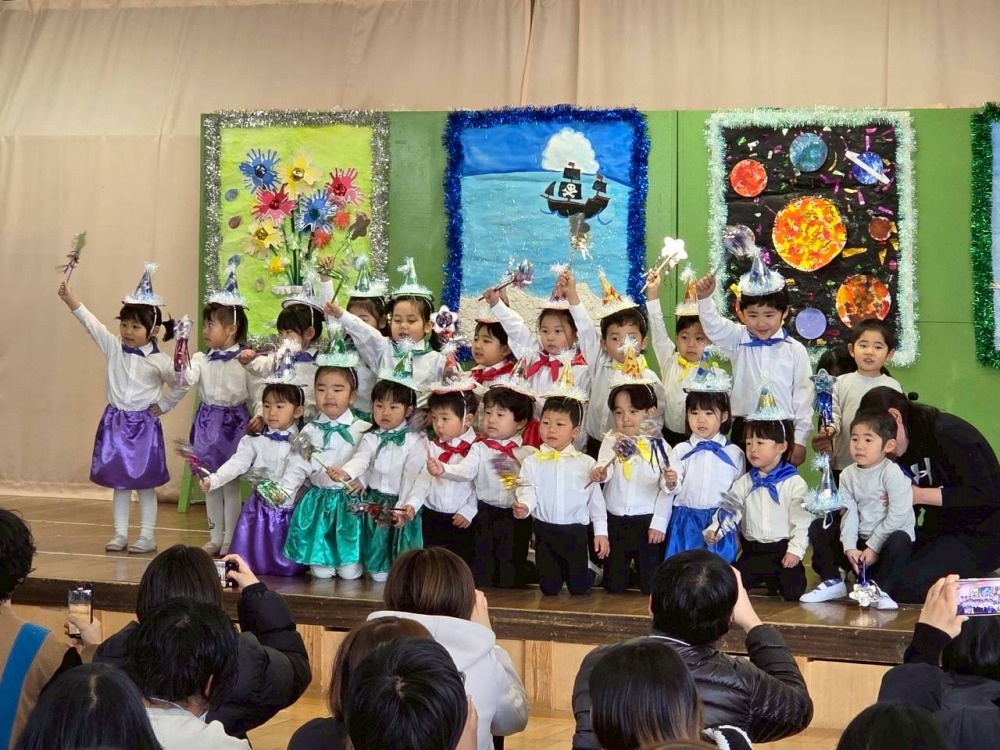 園内ホールにて、2月19日(木)ちゅーりっぷ組・あさがお組、20日(金)たんぽぽ組・もも組の生活発表会を行いました。プロジェクト保育で学んできたことを、リズムの振り付けや衣装に取り入れ、曲に合わせて元気に笑顔で踊って表現しました。2クラス合同の合唱では、「Seven Steps」「たのしいね」を素敵な歌声でホールに響かせました。お家の人の前で披露できた喜びや、たくさんの人に褒めてもらえた経験は、今後の子どもたちの成長の支えとなることと思います。