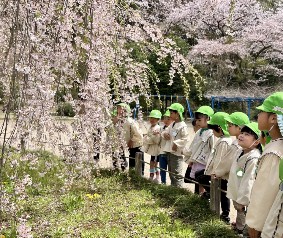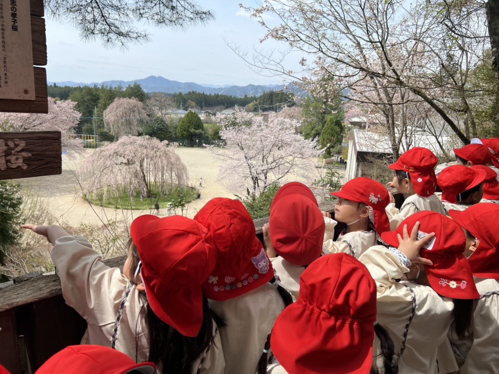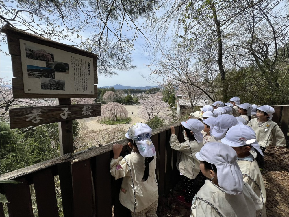 城山西小学校に孝子桜の見学に行きました。孝子桜を間近で見学すると、「おおきいね。」「花びら何枚あるかな?」「匂いするかな・・・?」と興味津々な様子や、校舎の後ろにある展望台まで登り、高いところから桜を見ると、「わー!きれい!」「やっほー!」「かぜがきもちいいね!」と大喜びな姿がありました。