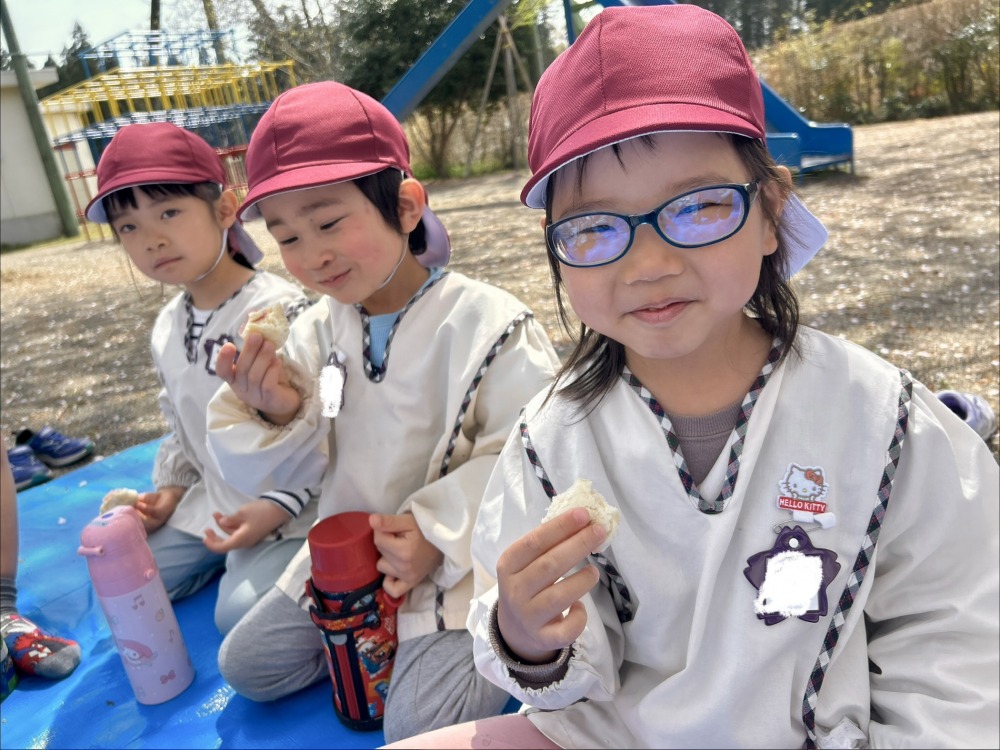 また、桜の木の下で桜まんじゅうを食べると、「さくらのいろのあんこだ。」「おいしい。」と大絶賛でした。子どもたちにとってとても楽しい見学となりました。