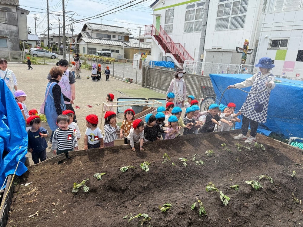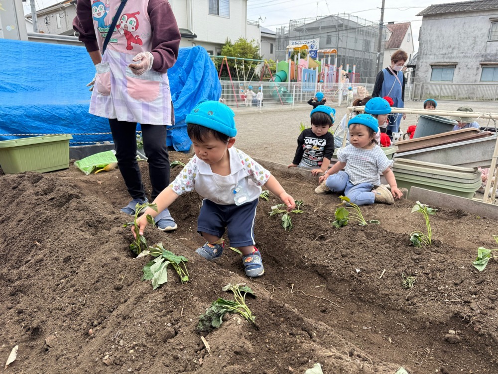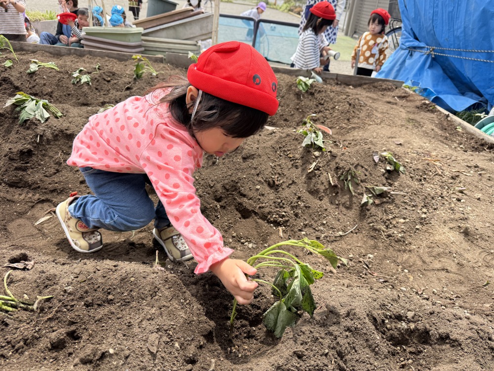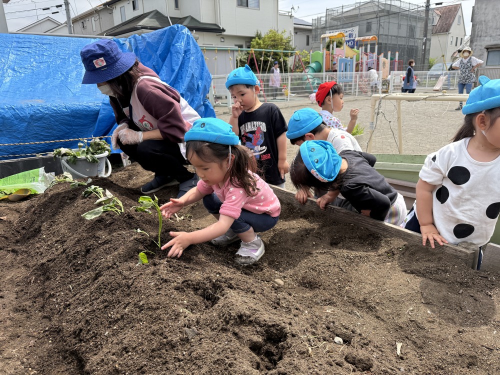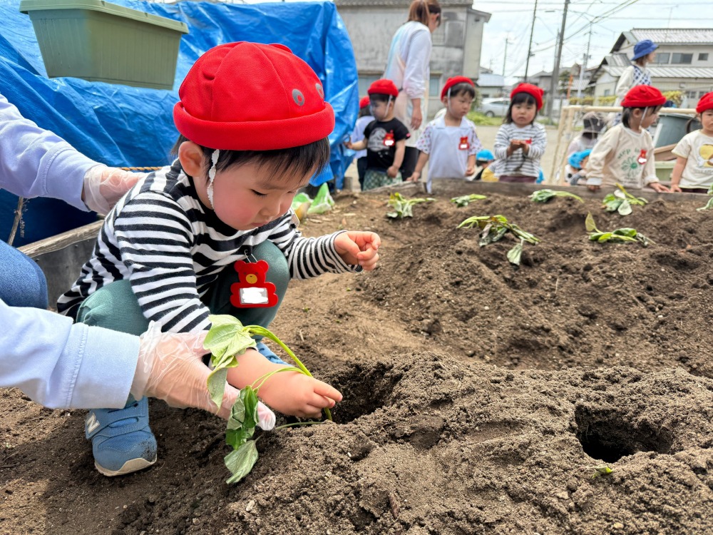 ぺんぎん組とパンダ組で第二運動場の畑にさつまいも(シルクスイート)の苗を植えました。畝に穴を開け、子どもたちは保育者と一緒に苗を入れて土を被せました。「大きくなりますように!」と願いを込めながら水をたっぷりあげました。子どもたちと一緒に、さつまいもの生長を観察していきたいと思います。