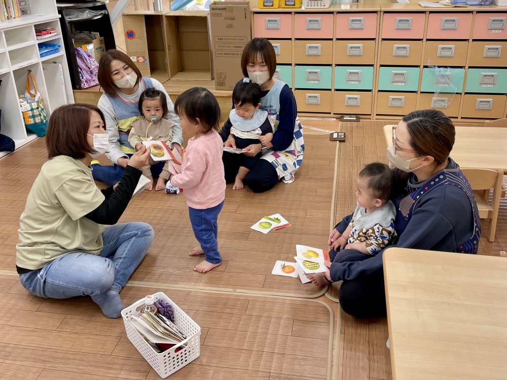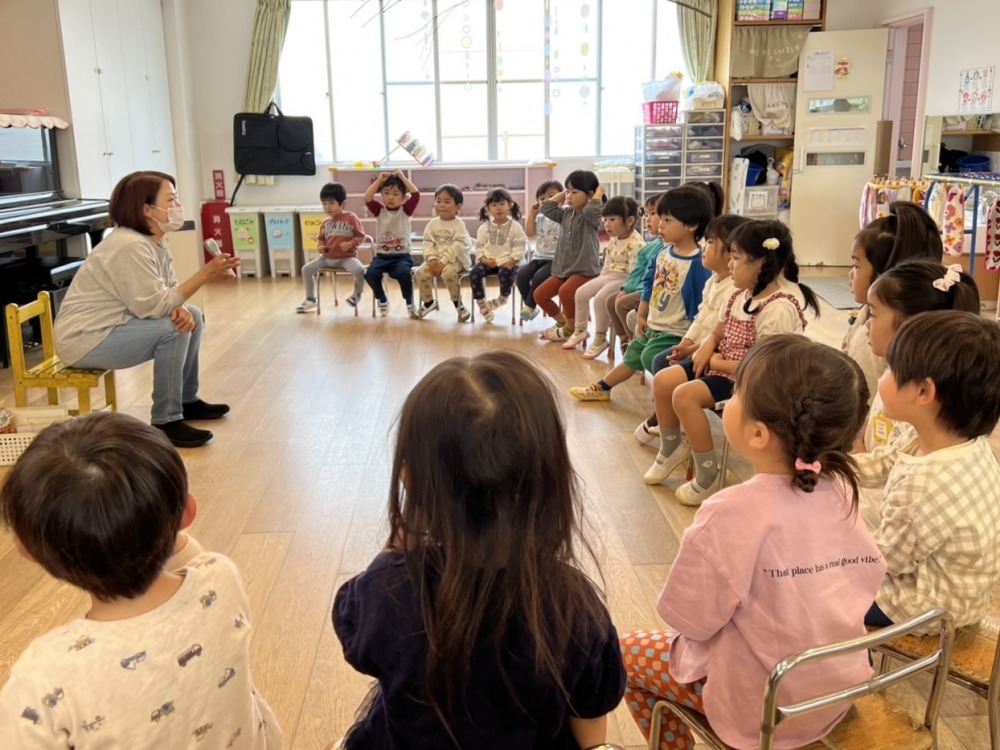 新入園児の子どもたちははじめは緊張していましたが、保育者と一緒に参加する中で笑顔が増えてきました。進級児の子どもたちは「Hello.」「Here you are. 」「Thank you.」などの挨拶や、講師とのやり取りを楽しんでいます。今年度も、歌や手遊び、やり取りを大切にしながら、子どもたちが「英語って楽しい。」と感じられるよう活動を行っていきたいです。